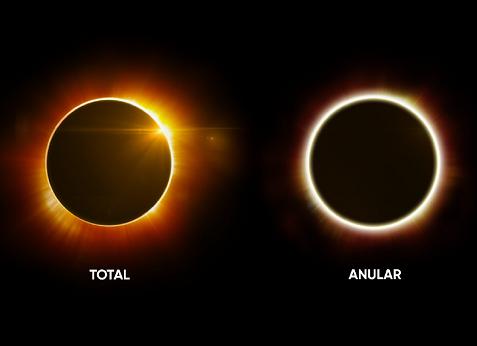Anular: SOcurre cuando el observador ve que el disco lunar no llega a cubrir el disco solar, aunque sus centros estén bien alineados. La razón es que, ese día, la Luna se encuentra más lejos de la Tierra que en el caso de un eclipse total. En consecuencia, el disco lunar se observará más pequeño que el disco solar y también se apreciará un anillo brillante rodeando el disco lunar.