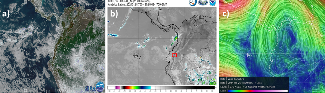 Esto ha ocurrido debido a una formación anticiclónica sobre la región de Colombia que desvía el flujo de humedad hacia el norte de Sudamérica (Figura 4); e impide que la humedad proveniente de la Amazonía se eleve y condense limitando la formación de nubes (subsidencia) y viaje hacia la región Sierra.