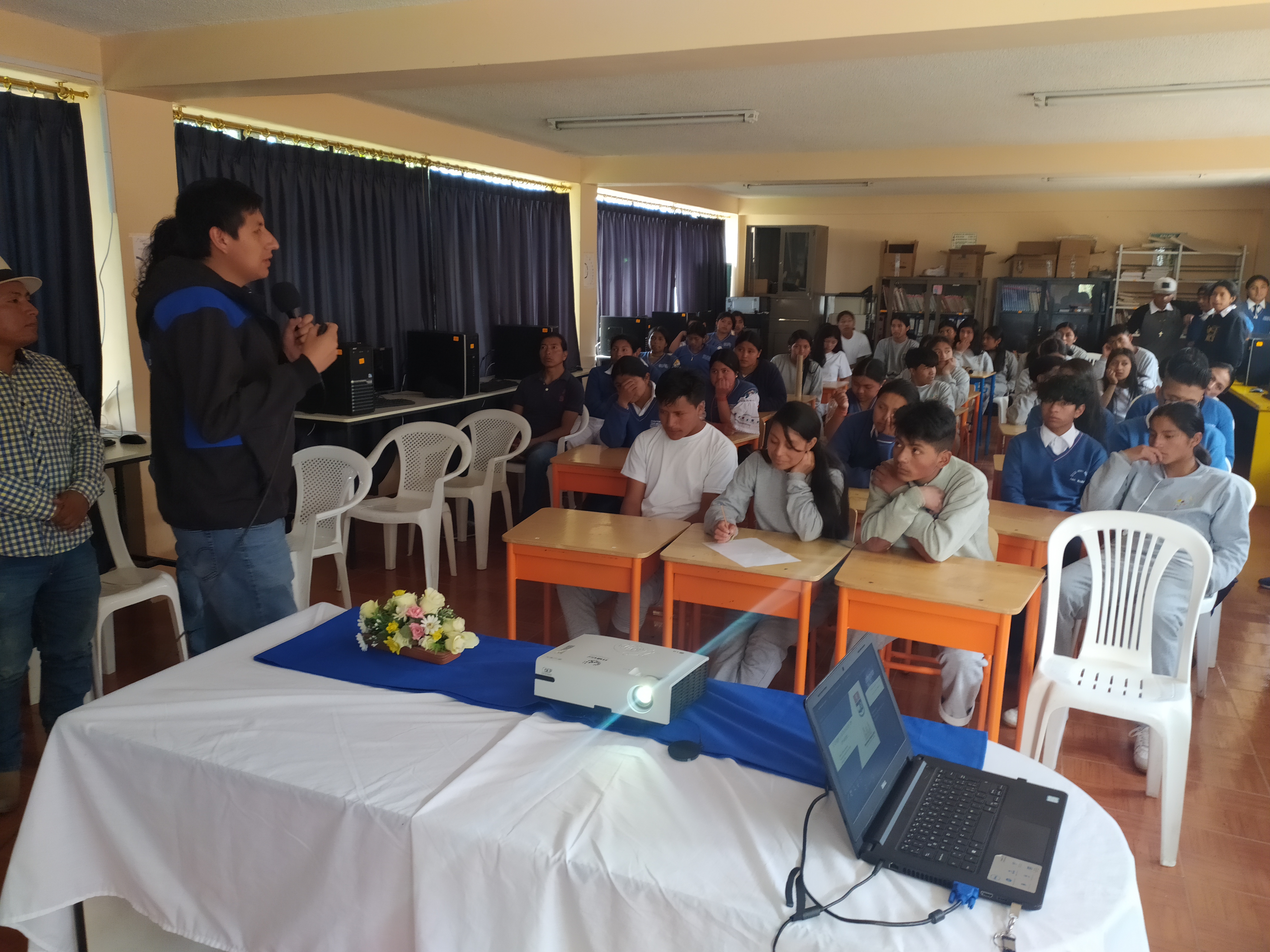 Durante la charla de divulgación: “El origen del Universo”, dictada por el Fis. Franklin Aldas, de la unidad de Astronomía del Observatorio, se realizaron intervenciones de los estudiantes que participaron activamente con el expositor para despejar sus dudas.
