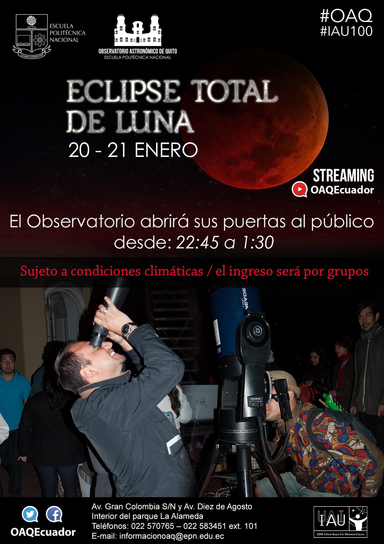 El día del eclipse, la Luna estará cerca del perigeo (punto más cercano en su órbita alrededor de la Tierra), viéndose así más grande de lo habitual. A pesar de que el eclipse se puede observar a simple vista, el OAQ transmitirá (en vivo) todo el evento por streaming a través de su canal de youtube OAQEcuador. Además, el OAQ abrirá sus puertas desde las 22:45 (del domingo 20 de enero) hasta la 01:30 (del lunes 21 de enero) para que la ciudadanía pueda observar el eclipse con instrumental especializado (observaciones sujetas a las condiciones climáticas).